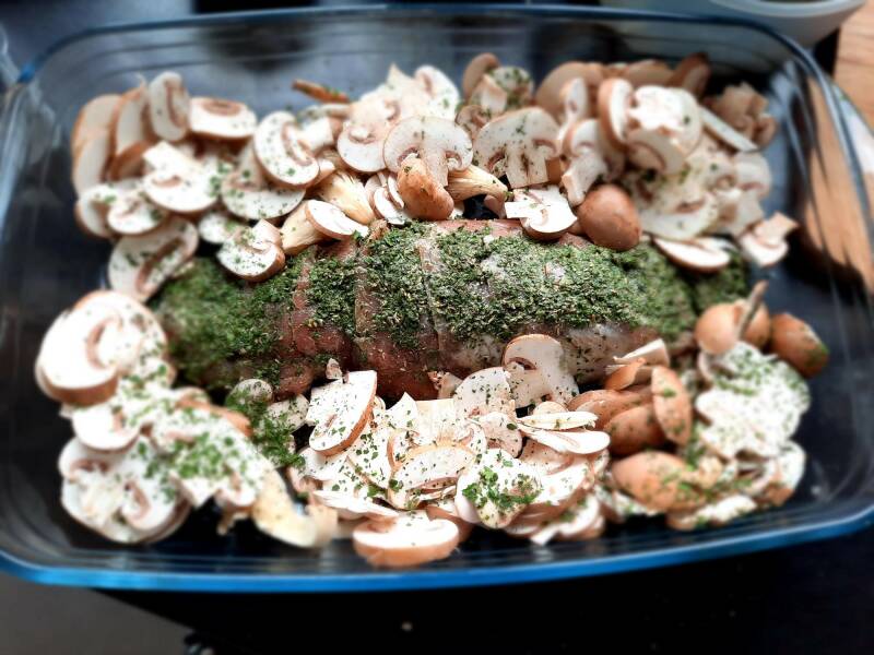 3. Snij de verse of champignons uit blik in schijfjes. Drapeer ze rond het varkenshaasje en kruid af met peper en zout.