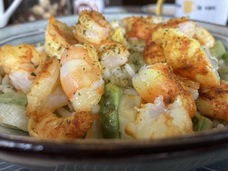 Doe 1/2 el knoflookolie in de pan, voeg de gepelde scampi's toe. Kruid af met peper, paprikapoeder en kurkuma. Draai ze om, bak ze enkele minuutjes aan elke kant en haal ze uit de pan.