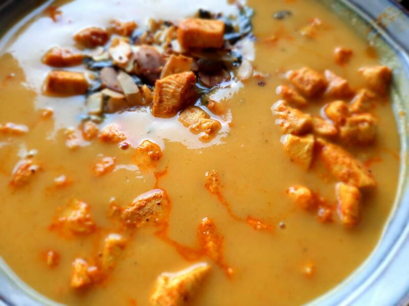 Recept voor een heerlijke maaltijdsoep met pompoen, kip en nootjes