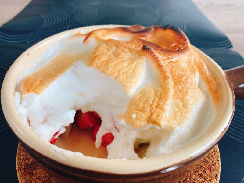 snij het fruit in kleine stukjes, leg deze op de bodem van een vuurvaste ovenschaal of kommetje. Voeg het opgeklopt eiwit toe en plaats een 3-5 tal minuten onder de gril tot je een licht bruin korstje hebt.